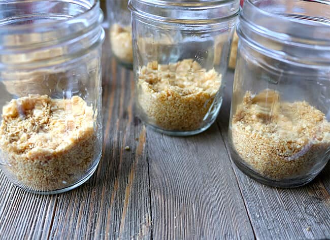 Next, place the graham crackers at the bottom of small canning jars.