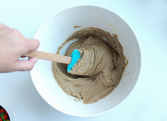 first, melt your butter, then mix it together with the eggs, brown sugar and vanilla. after that's all combined, add in the flour. Mix thoroughly and then add in the M&M's.
