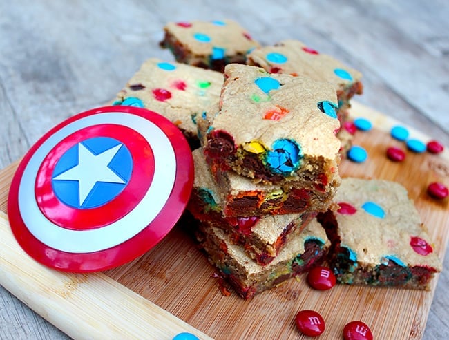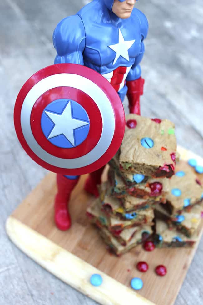 to celebrate the release of Captain America: The Winter Soldier, we made some yummy Superhero M&M’s Blondies. these blondies are super soft, moist, and fast to make. it's a really easy M&M's Blondie recipe! the batter comes together in one bowl, in 5 minutes, without using a mixer. that means you'll have plenty of time left to save the world. or just to watch the new Captain America movie!