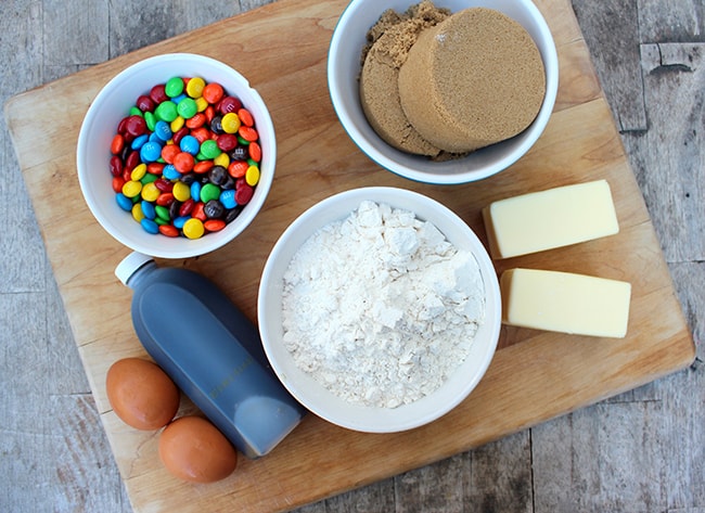 to make these fun treats, you'll need M&M's, brown sugar, eggs, vanilla extract, flour and butter.