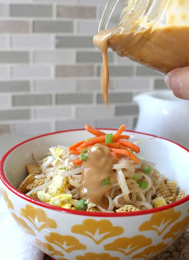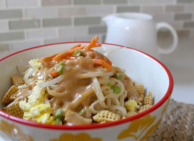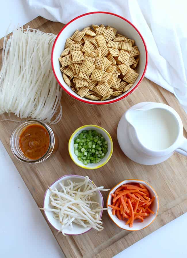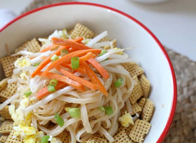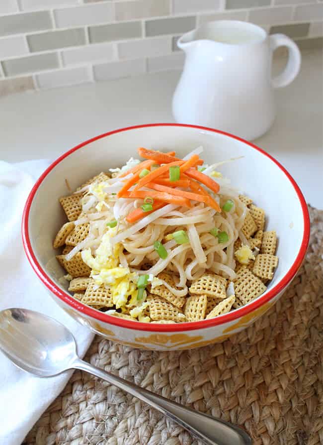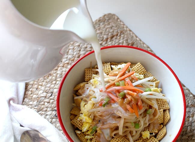 the rest of the ingredients are pretty simple. besides the milk and Corn Chex cereal, we also needed Thai rice noodles, scrambled egg, bean sprouts, shredded carrots, chopped green onions, and a special peanut Pad Thai sauce.
