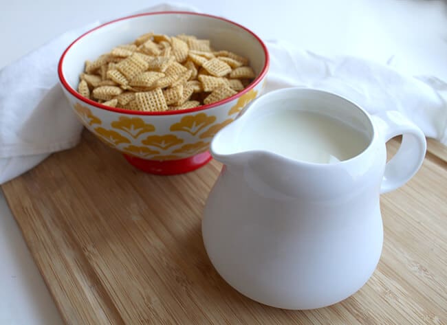 to start our culinary cuisine, we needed our hero ingredients! ice cold milk and Corn Chex cereal. you definitely can't eat cereal without milk.