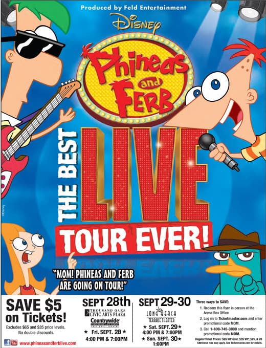 well.....IT'S BACK! Disney’s Phineas and Ferb: The Best LIVE Tour Ever! is back in Southern California! produced by Feld Entertainment, is bringing Phineas, Ferb, Candace, Isabella, Baljeet, Buford and friends to the stage as they make the most of the last day of summer by building an invention bigger, better and more amazing than ever. before anyone can wonder “Hey! Where’s Perry?,” the pet platypus dons his Agent P fedora, and hilarious hijinks unfold as he battles Dr. Doofenshmirtz to save the Danville Tri-state area and audiences everywhere from the evil scientist’s most havoc-wreaking scheme to date.