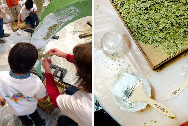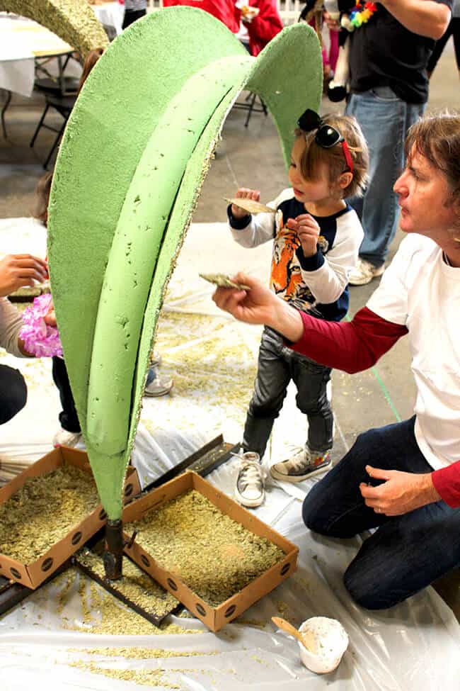 the kiddies even got to help decorate the float by covering the structure with leaves and seeds. the rule is that each float entered in the parade be completely covered with natural elements. here the kids are coating the structured leaves with glue and then covering them with crushed bay leaves.