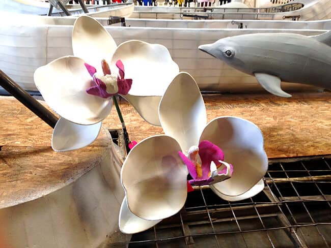 throughout this floral masterpiece, fresh and healthy GMO-free fruits, including bananas, pineapples, mangoes, and papayas that are grown and provided by DOLE for use on their float will be featured. sculptured Cattleya and Phalaenopsis orchids, colorful yellow hibiscus (the state flower of Hawaii), dainty plumeria and various seashells finish off this tropical setting. finally, 16 dancers at street level will perform authentic hula and Pacific-Island dances that encompass the melting pot of today’s Hawaiian Islands.