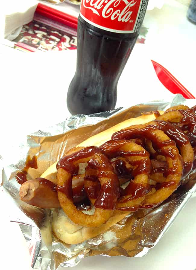 LORD OF THE RINGS DOG, a yummy BBQ sauce, topped with onion rings. $5.45