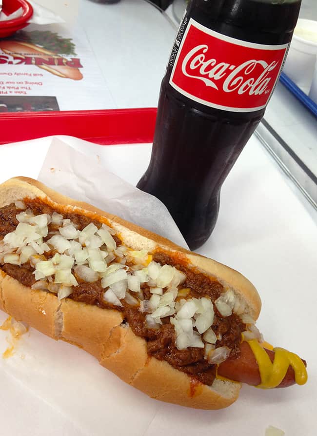 but of course Pink's has classics like this CHILI DOG, with mustard, chili and onions. $3.85