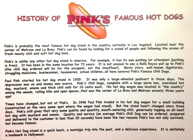Pink's has been serving hotdogs in LA since 1939, as it began as a Mom and Pop hot dog stand. it all began when Paul & Betty Pink started selling hot dogs from a cart on a neighborhood street corner at La Brea & Melrose. everyone loved their hotdogs so much, that they are still serving them up today.