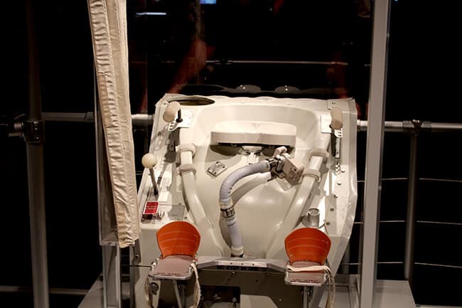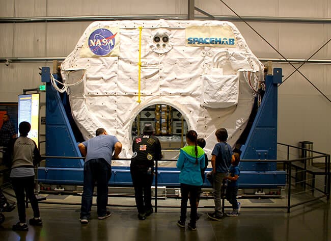 in addition to viewing the Space Shuttle, there is an exhibition hall that has exhibits showing different space stuff. here we are checking out the microwave that was in the space shuttle, how the astronauts stored their belongings and also some of the items the astronauts brought with them into space.