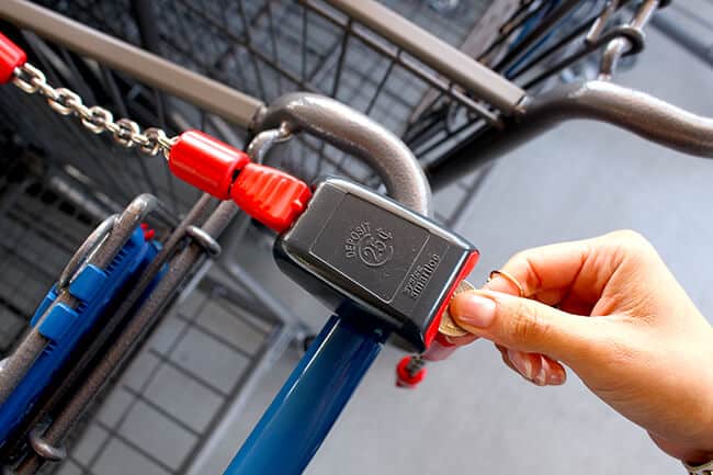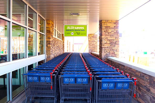 when you arrive at ALDI, you will want to bring a quarter with you. if you need a cart, a quarter will unlock it and give you access to using it. after you have shopped, simply bring the cart back, lock it up, and you will get your quarter back. this cart return program helps ALDI lower the costs of their products because they aren't paying team members to gather carts to work gathering carts up in the parking lot.