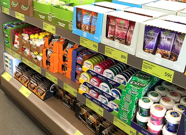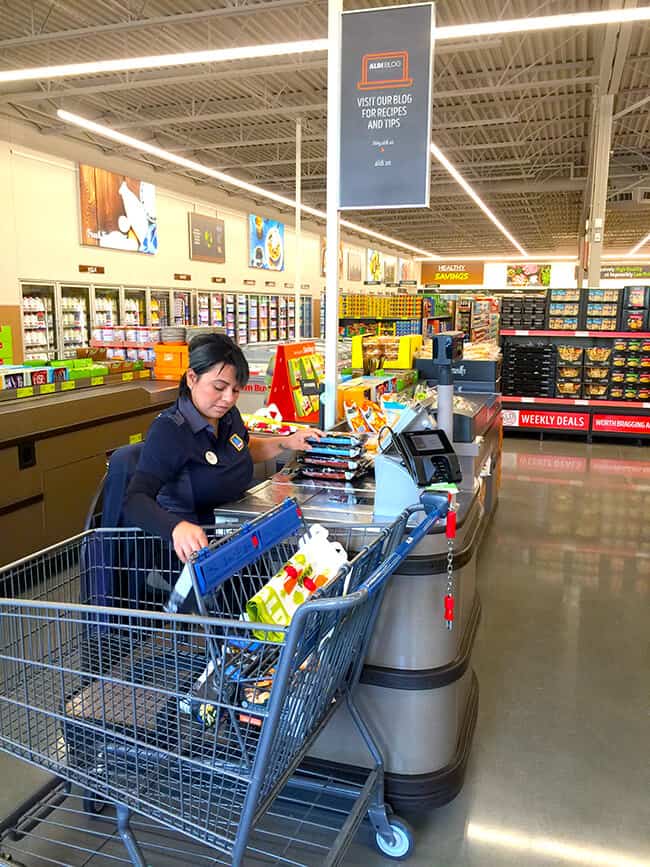finally, checkout at ALDI is also different than other grocery stores. first, you will notice the absence of a lot of the sweets and treats. in their place you will find better for you snacks and items you need like batteries and mints.