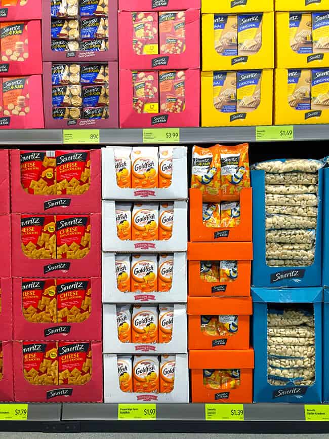 more than 90 percent of the groceries sold at ALDI are ALDI premium exclusive brands. they are regularly tested in the ALDI Test Kitchen to make sure the quality and taste is just as good, if not better, than the national brands. for instance, the cheesy crackers below. they still have the name brand that everyone knows...but also an ALDI premium exclusive brand. just look at the price! the ALDI brand is significantly cheaper. ALDI has found that customers tend to love their brands even more than the other. and trying new things at ALDI is risk-free because of the ALDI Double Guarantee. if for any reason a customer doesn’t like an ALDI exclusive brand food, they’ll give them their money back and replace the product. so why not try it!!!!