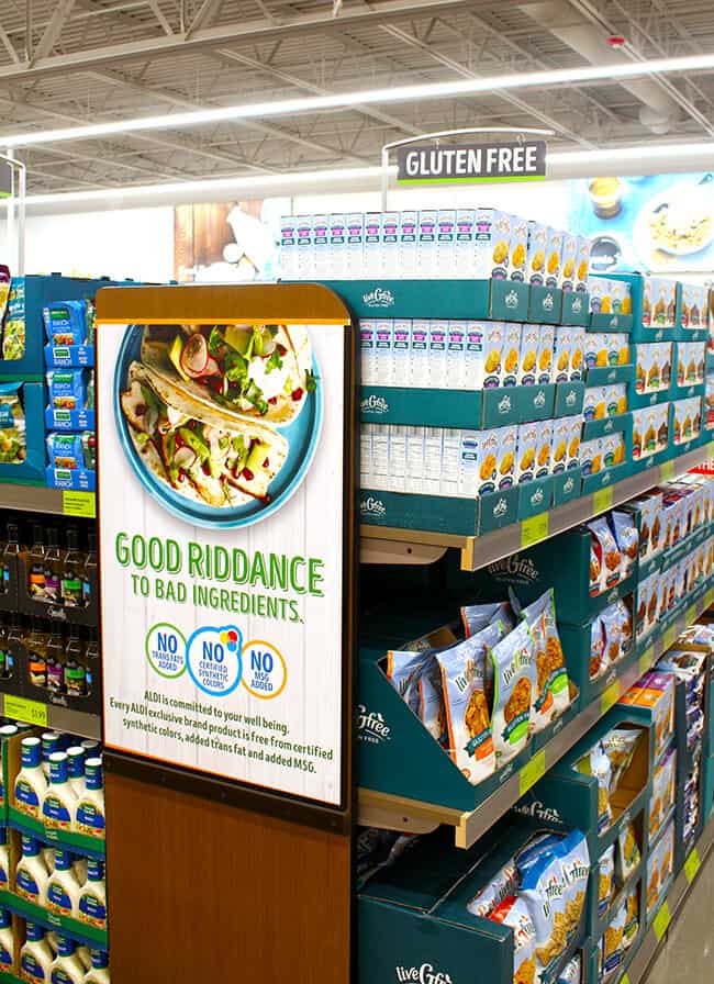 need gluten free products? ALDI offers a variety of gluten-free foods, because they know how increasingly important they have become to customers in these past few years. the ALDI liveGfree line includes everything from baking staples and mixes to breads, crackers, chewy bars, cookies, frozen foods cereals, pastas, and more.
