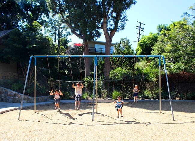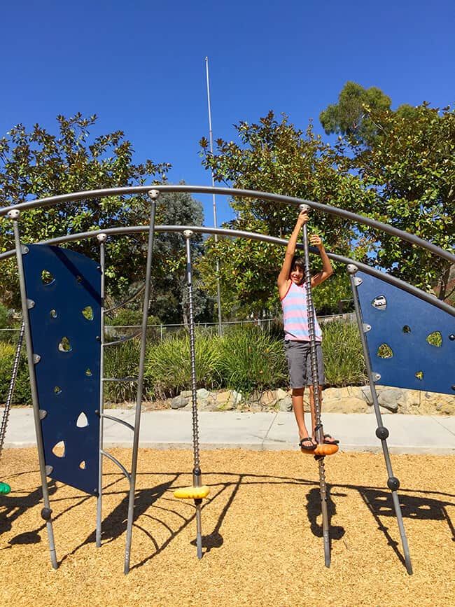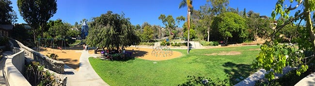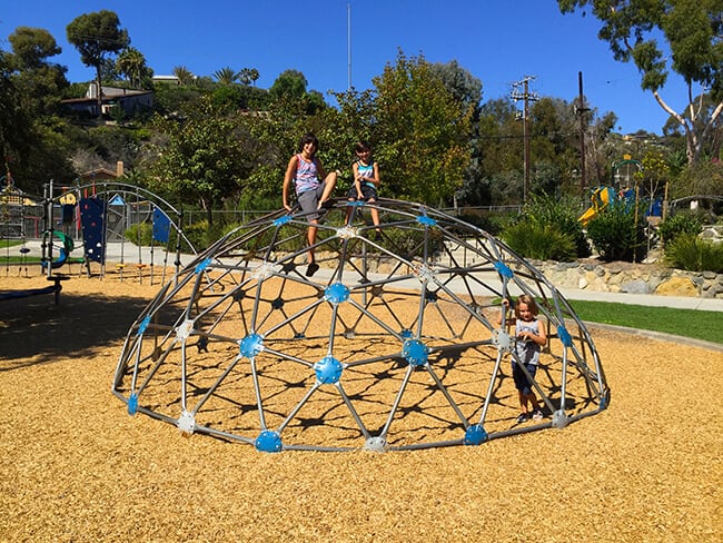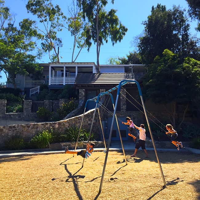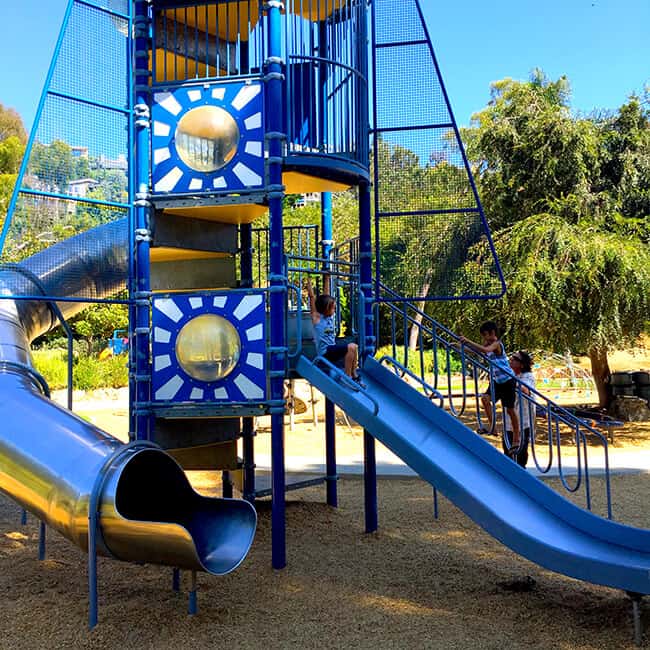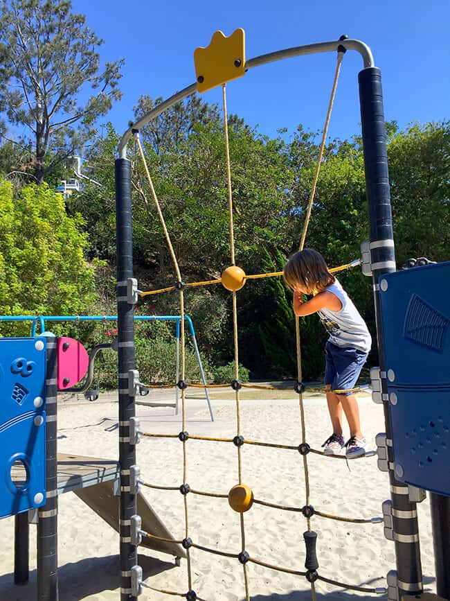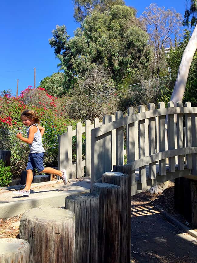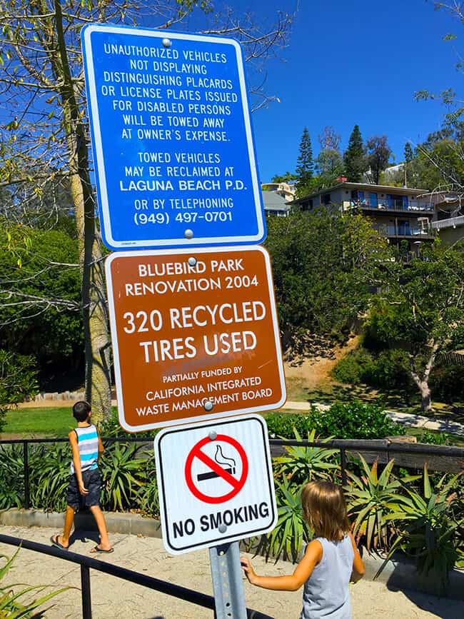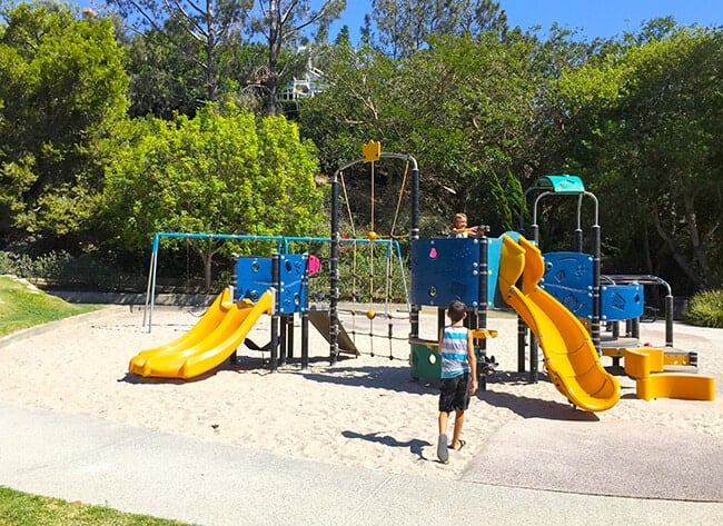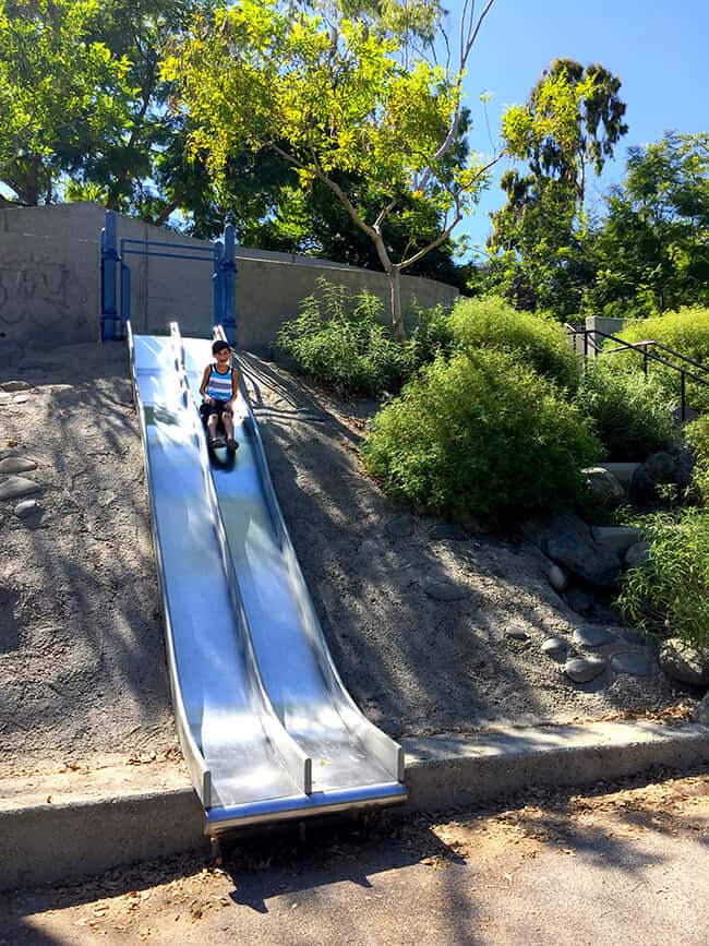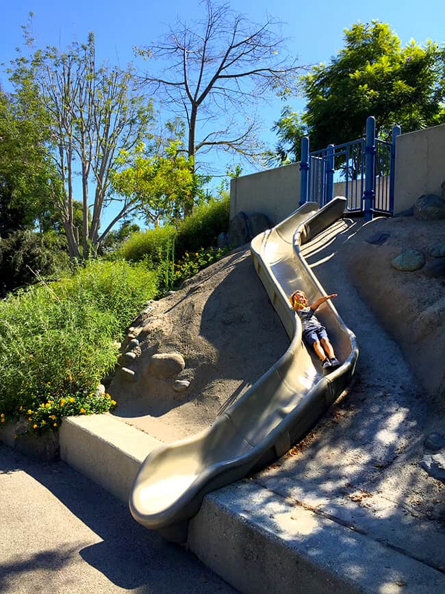 Bluebird Park Laguna Beach really is a special place to visit. The boys were excited to find fun slides along the walkway that they could slide down into the park from the top of the walkway. AWESOME! The slides are nice a big, so it was a blast going down them over and over.