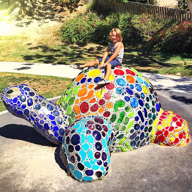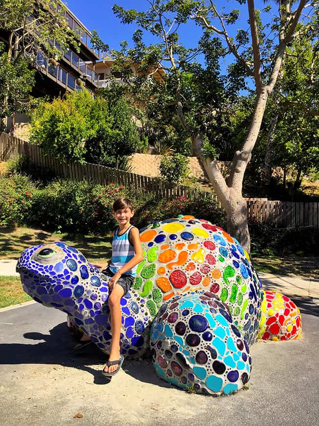 One of the most iconic things in Bluebird Park is this rainbow mosaic turtle sculpture. it is unique and beautiful, and just make you smile looking at it. the boys begged my to take picture of them sitting on it.