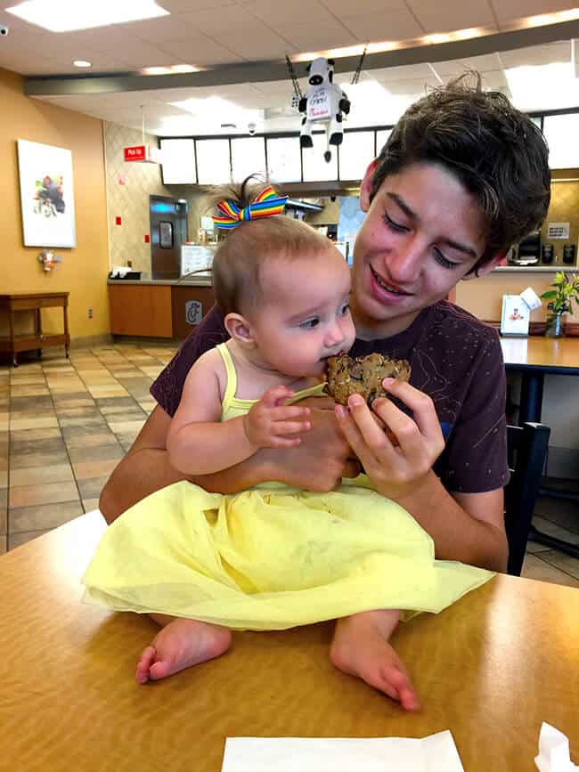 so take your family, take your friends, treat yourself to a yummy Chocolate Chunk Cookie! you deserve it...and so did the children at CHOC. we couldn't wait to show our support, so we ran down there for breakfast this morning. yep, cookies for breakfast. little miss Dani has never had a cookie before...but she took that matter into her own hands. we couldn't keep them away from her.