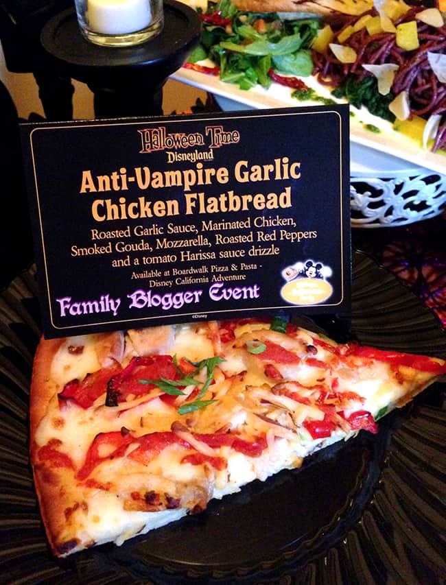 and vampires will stay away with this delicious slice of Anti-Vampire Garlic Chicken Flatbread pizza. its cheesy goodness is from Boardwalk Pizza and Pasta. this Halloween pizza delight is topped with roasted garlic sauce, chicken, smoked gouda, mozzarella, roasted red peppers and a tomato harissa sauce drizzle.