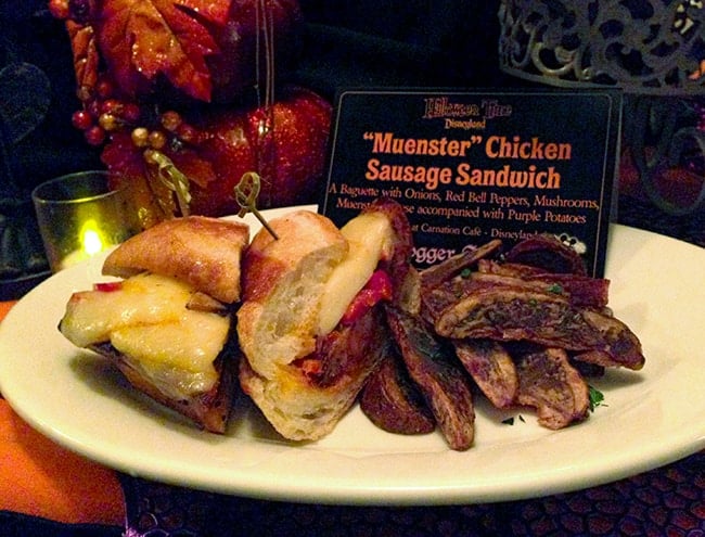 during the week of Halloween, Disneyland will offer some special menu items that are to die for! you can get the ooey, gooey, cheesy, Munster Chicken Sausage Sandwich at Carnation Cafe. it is covered in muenster cheese, onions, red bell peppers, and mushrooms and all the yumminess that comes along with it.