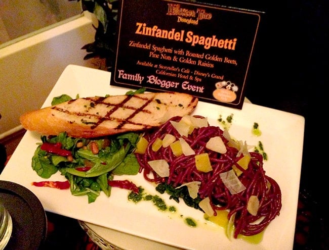 how about this Zinfandel Spaghetti with roasted golden beets, pine nuts and golden raisins. you can find it at Storytellers Café at Disney’s Grand Californian Hotel & Spa. the pasta gets its “seasonal” color from wine and it’s only available the week of Halloween. so fun!
