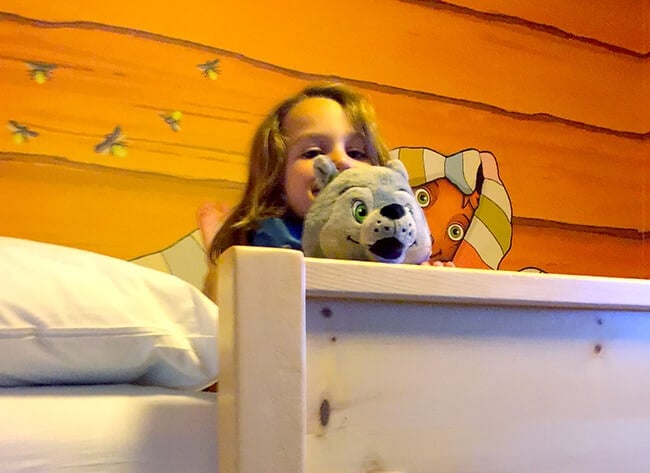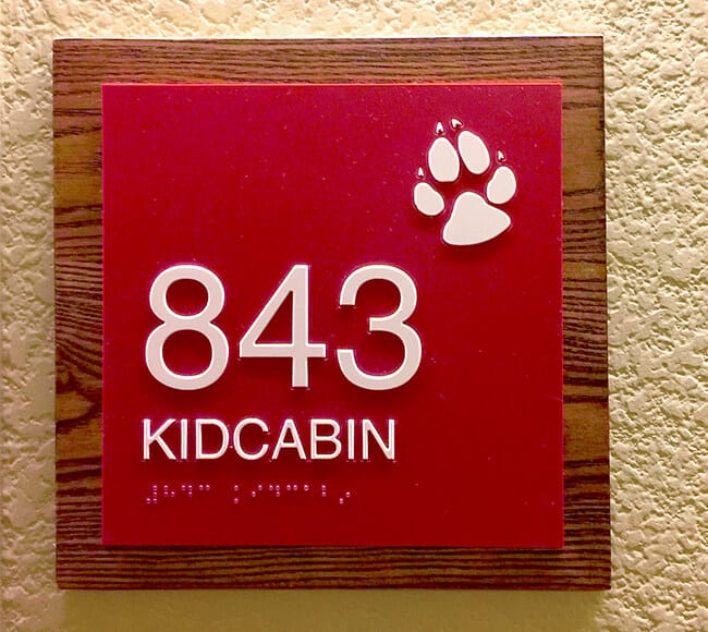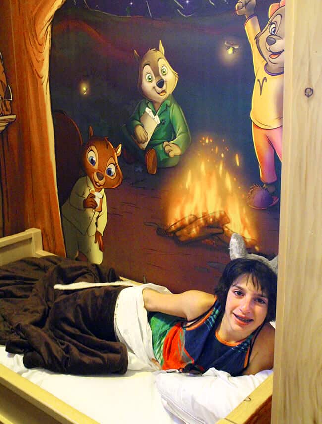 the rooms are fun...decorated in rustic cabin style. there are many types to choose – from standard to deluxe. we happened to stay in a "Kid Cabin" which has a separate area for the kids with themed wallpaper and creatures on the wall that have special effects when you wave a MagiQuest wand at them.