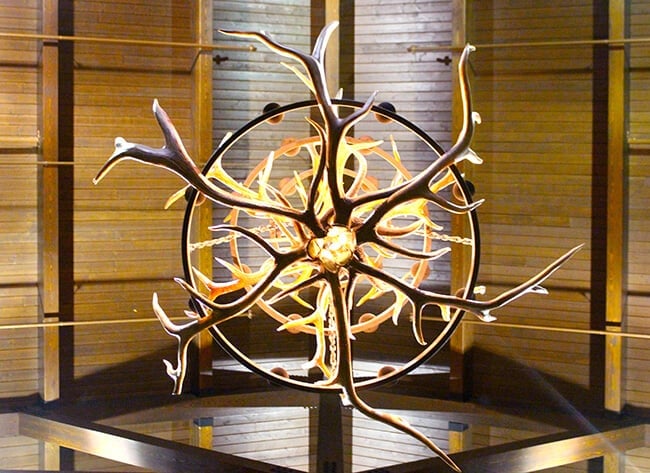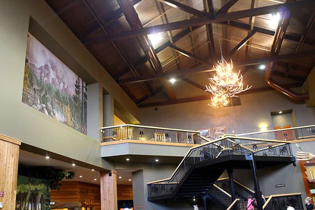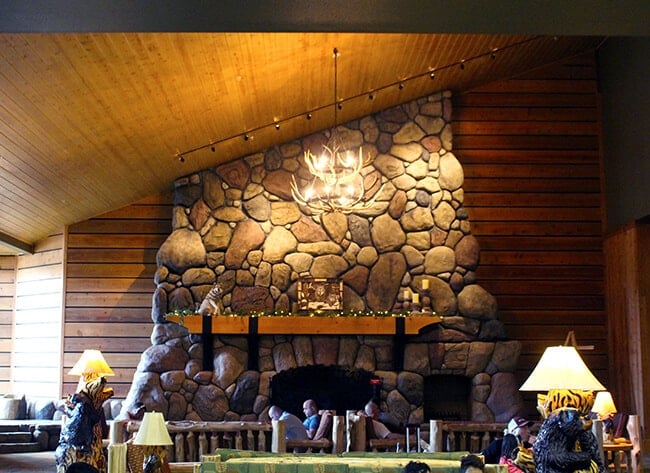 when we walked in the lobby, we were greeted into a grand lodge...with vaulting ceilings, a gigantic stone fireplace that is used as a gathering place for bedtime story time and dance parties, and wilderness murals flanking the walls.