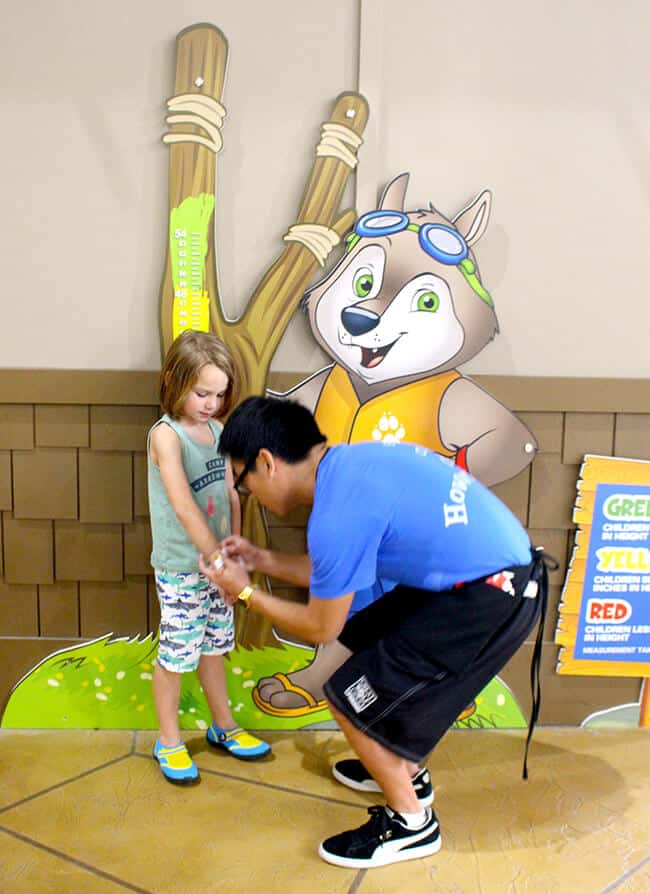 the rooms were cool...but not where we wanted to spend the day, as there were so many more things to explore at the GWL. we changed into our swim suits and headed out.....straight to the water park! because that's the main reason why you stay at GWL. when you enter the water park, the kids get measured and given a color coded band that lets you and the lifeguards know which rides you are safe to ride on. you can also get pool towels.