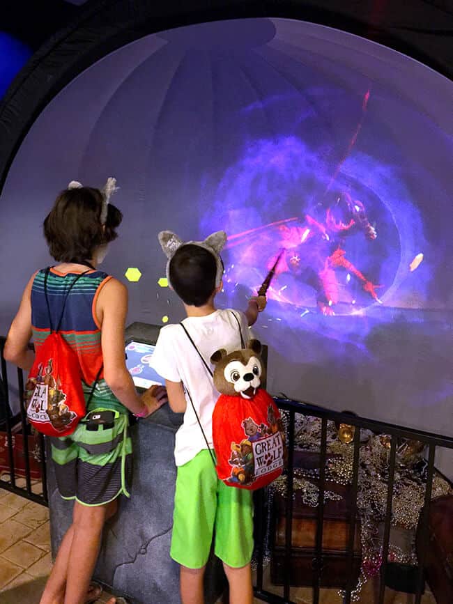 we experienced so much more at GWL then just the water park. there are tons of fun activities to do there. one thing we noticed right away, is that lots of kids were running around with magic wands. they are part of the game, MagiQuest, that is played at kiosks throughout the entire hotel. you can purchase a wand of your choice, and even customize it if you'd like, the follow the clues as you wave your wand at the different stations. this was an additional highlight of our trip for the boys – the fun lasted throughout the entire weekend while we were at the hotel. after the boys solved all the clues at each station, they were able to fight the dragon at the end. MagiQuest was the perfect adventure for my older boys.
