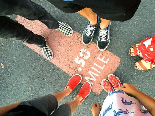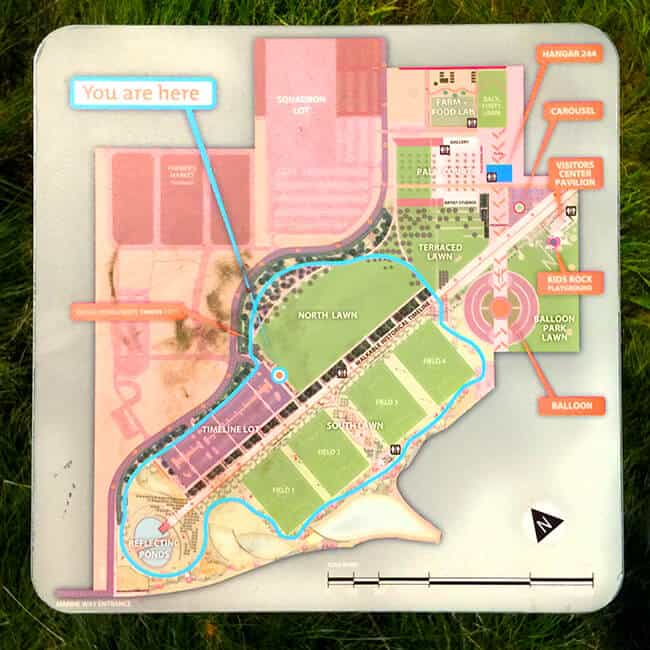 The Thrive Walk at the Orange County Great Park is located around the North Lawn and winds around the grass fields and reflection pond. It's pretty easy to find using this map. The turquoise line represents the Kaiser Thrive Walk.
