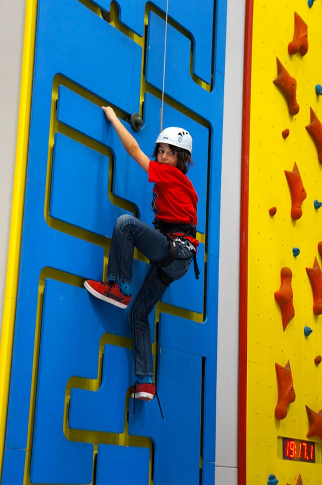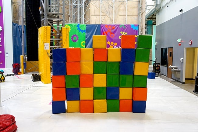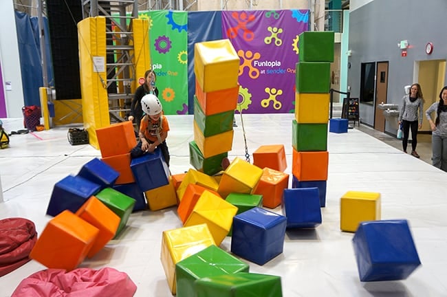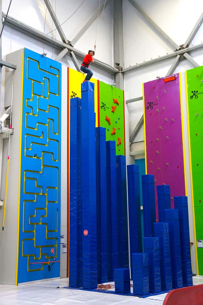 even my little guy loved Funtopia. he was a little shy to climb the big walls, but he was content playing with the foam blocks and hanging on from the ropes. you can even stack up the blocks to climb on…..