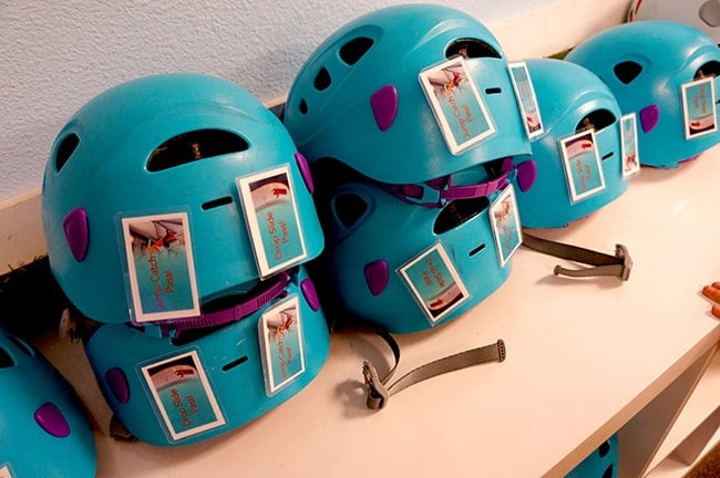 before you head into the Funtopia climbing area, you are fitted with a harness and helmet. children should be a least 40 pounds to play, and instructors show a quick video to show you how to play on the Funtopia equipment.