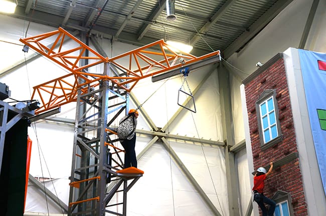 the harnesses you wear, can quickly be connected to different rope pulleys all over the Funtopia facility by the trained instructors. everything has been planned out with safety in mind. and there are many different obstacles and play things to try out at Funtopia. you can jump across the air and land on a velcro wall that will leave you hanging….