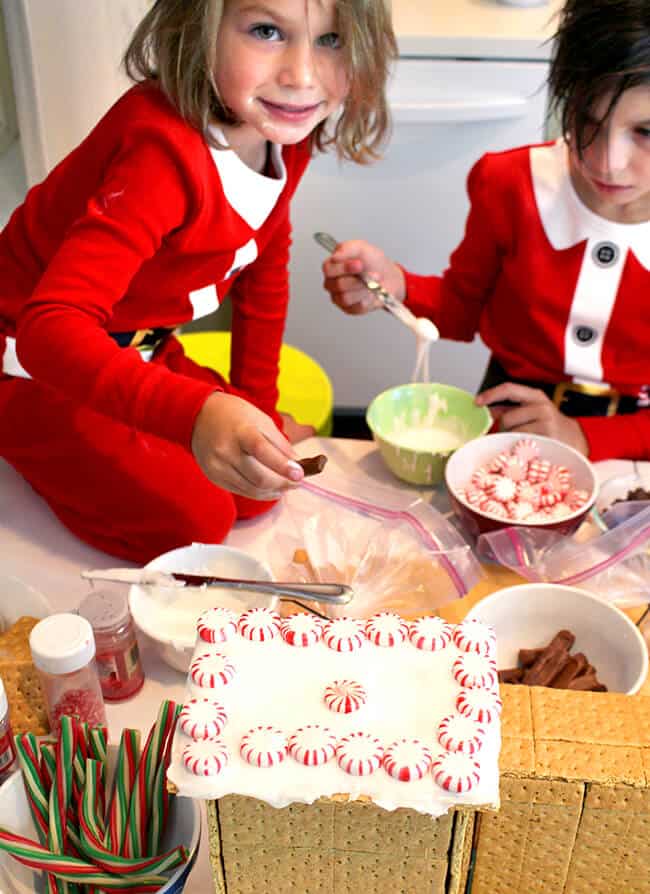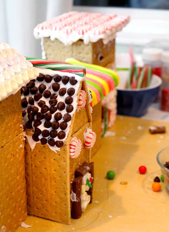 so we headed over to the store and bought a bunch of graham crackers, powdered sugar for icing, sprinkles,and candy. we also had a lot of left over candy from Halloween which i have been saving for gingerbread houses, so that worked out perfect. then we found a piece of wood for the base and some small boxes to glue the graham crackers to for the houses.
