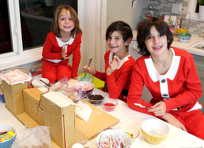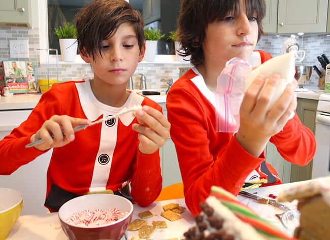 now that we had all the supplies for the gingerbread houses, the boys went to work on setting up the kitchen to build them. first, they changed into their Christmas jammies. they could wait to start wearing them, so i said they could go ahead and put them on. i usually wait till December 1st to give them to them, but i guess a few days early doesn't matter. i love that they get to enjoy wearing them the entire Christmas season. next, they went through the Halloween candy and sorted out the candy we would use into separate dishes.