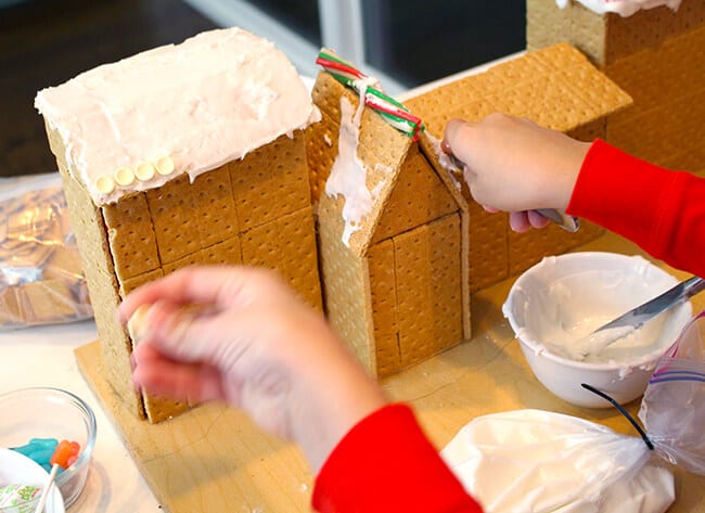 i made a triple batch of royal icing, and helped glue the graham crackers to the small boxes to look like little stores. the boys wanted to make a gingerbread beach town with an ocean.