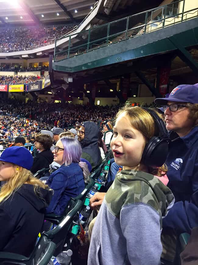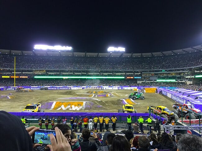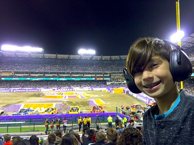 after dinner, it was time to head into Angels Stadium. it was all very exciting to see it all ready and set-up for a Monster Jam race and freestyle competition. it also is super load once the truck get going, so it is really important to protect those kids ears from the noise...even adults need ear plugs.