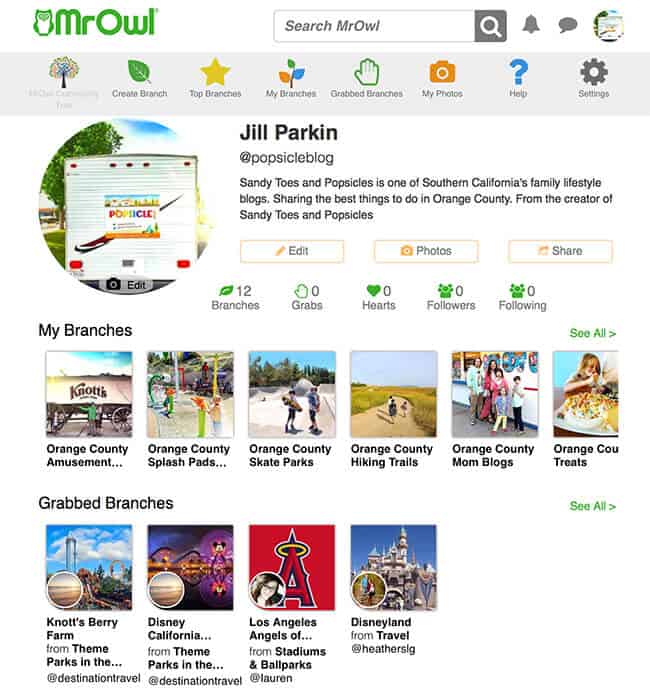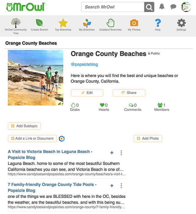 with MrOwl, you can also follow other people's branches of interest. currently, i have many branches of interesting things to do in Orange County and Southern California. if you chose to follow one, whenever i add a link something new, it will show up on the branch. you get to share in my fun.