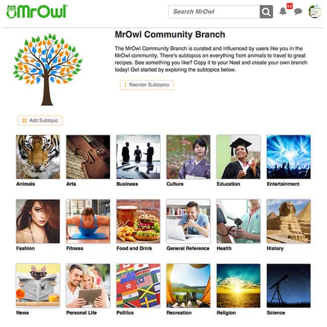 once you have created your account, you can set-up your own branches of interest. you need to create different branches for different categories. think of it as a HOME for all of your interests. then, you can search the internet and find links from websites you like to add to each of the branches. by using MrOwl’s unique search, you can find exactly what you’re looking for and organize all your content in ONE easy place. it's like your own personal filing cabinet of things you love.