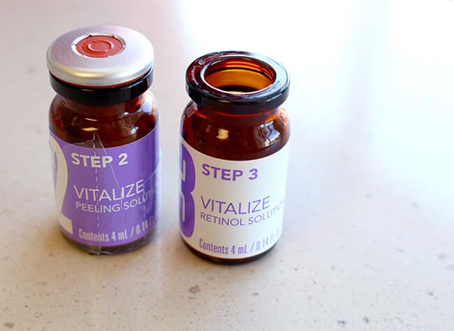 Since I am out in the sun a lot and with my lifestyle, a chemical skin peel would be a better fit. We chose the Vitalize Peel for my face – this peel helps fight the effects of time, sun damage and environmental assaults. It's powerful, yet non-damaging, and can take years off aging skin with very little downtime.