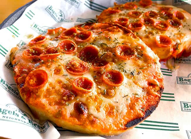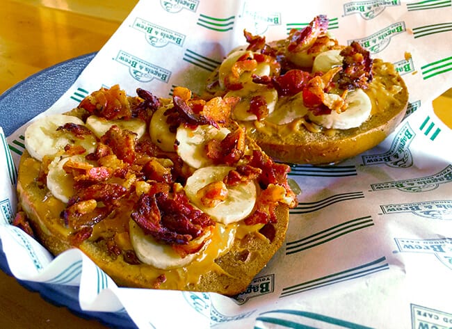 and while were were there, we decided to try out some of Bagels & Brew's newest creations. Pizza Bagels with mini pepperoni and the Elvis Bagel with peanut butter, bananas and bacon!!!!!