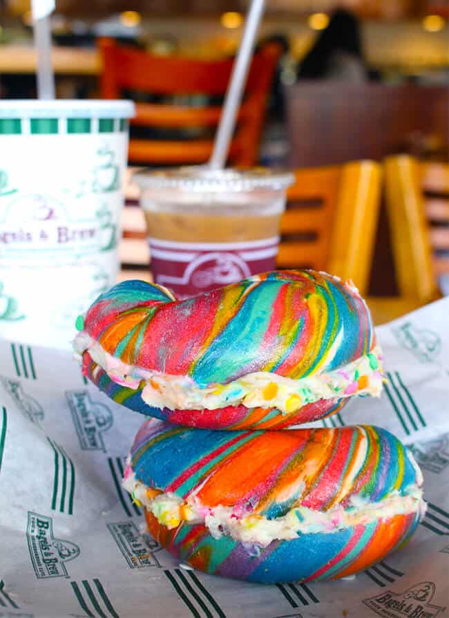when you love rainbow things as much as i do, and you find out they are selling amazing rainbow bagels at a bagel store in Orange County....you have to go check them out. Bagels & Brew just started selling Unicorn Bagels and i am over the moon. i spotted beautiful colored bagels like these ones in the photos of New York foodies on Insagram. i'd planned that next time i was in New York, i was going to get one. but when i found out that i could now get them near home i was pretty excited. the boys and i just had to try them out!