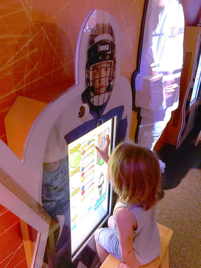 located around the Zamboni, are lots of really cool hockey experiments waiting for you to try. two of our favorites are Reaction Time, where you can test your reaction time to sound, light, and vibration. and Ice Time, where you can feel what an frozen ice rink feels like.