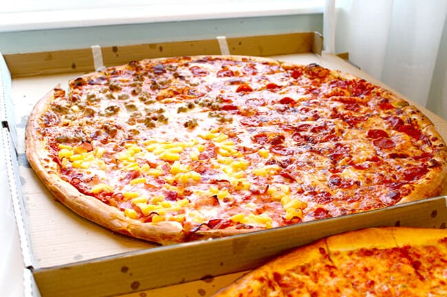 These giant pizzas start at $41.84 plus an additional cost for each topping. You can order plain cheese, get two halves with different topping or even quarters all with different toppings. each pizza has 45 slices and is cut in squares, not wedges.