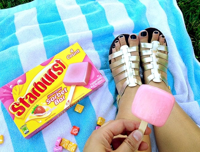 STARBURST™ Brand Sorbet Bars have the taste of a STARBURST™ strawberry fruit chew in a cold and refreshing sorbet bar. and even better, is that they are only 70 delicious calories each. its a great treat for me to curb my sweet tooth and enjoy a frozen treat on a hot summer days…or any day for that matter. they are especially perfect for us adults who are looking for just the perfect size frozen treat to indulge in.