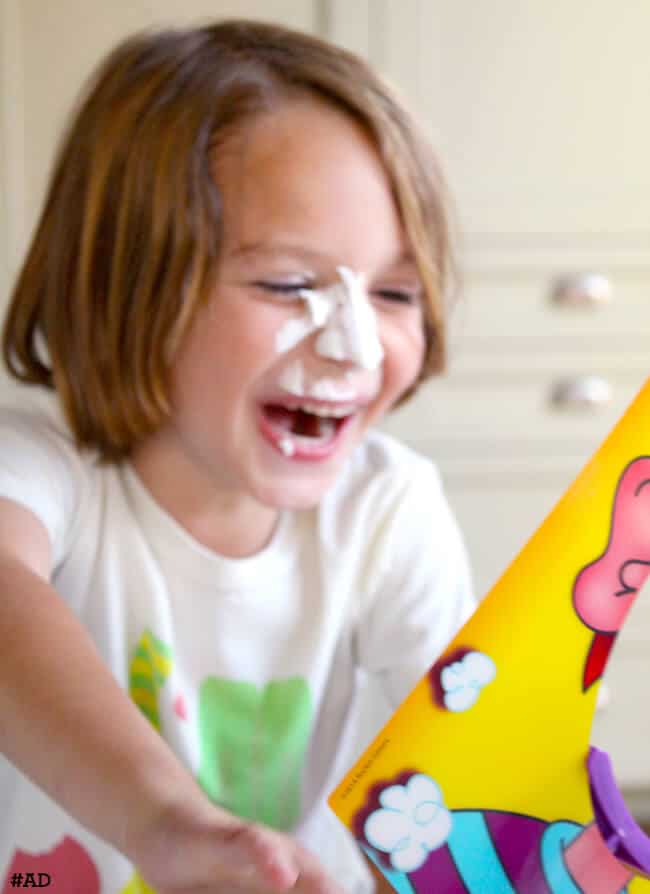 the Pie Face game is meant for children ages 5 and up and is great for kids and adults alike. spring and summer get togethers are coming up, and the Pie Face game is a great game to have on hand for entertaining.