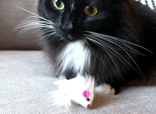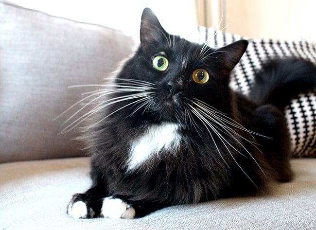 this is Phineas. he is mostly black with long, soft hair, and has the most adorable white tipped paws and white bib. he looks very dashing with a bow tie (now that was a cute meow moment). he is loud and likes to meow to get attention, and head butts you until you will pet him...but only on his terms. he loves to play with toys such as string and furry mice. and he is a big ball of fur.