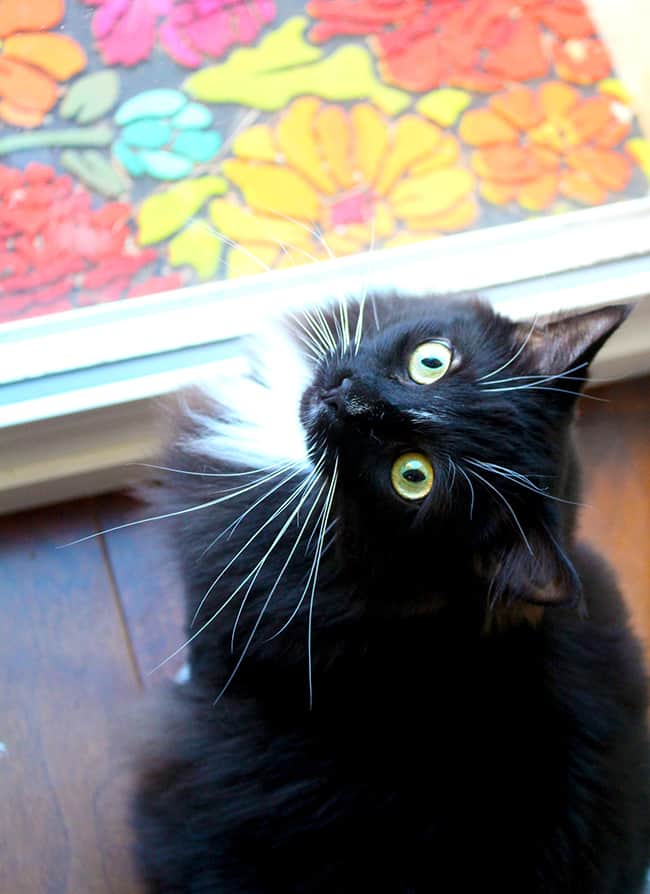 he especially loves my oldest son Jack, and spends a lot of his time in Jack's room. he is feisty, and loves to watch the birds through the window. he also likes to create lots of naughty meow moments when he rummages through my cupboards to chew on bags of cereal or when he sneaks into the garage and gets stuck under things.