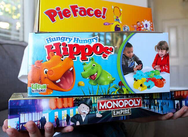 we've had so much fun playing and sharing about some of our favorite Hasbro games, that we thought it would be fun to share the idea of having a family game competition between all three games we shared with you - the Hungry Hungry Hippos game, Monopoly Empire game and Pie Face game. of course, playing all three of these games multiple times is going to take an entire evening...but there's absolutely nothing wrong with that! Just order a pizza or make a fun dinner, and have lots of snacks and treats on hand. Make sure everyone has their game faces on, because once the games get started...there's no telling when it's going end. you tend to lose track of time when you are having a fun family game night!