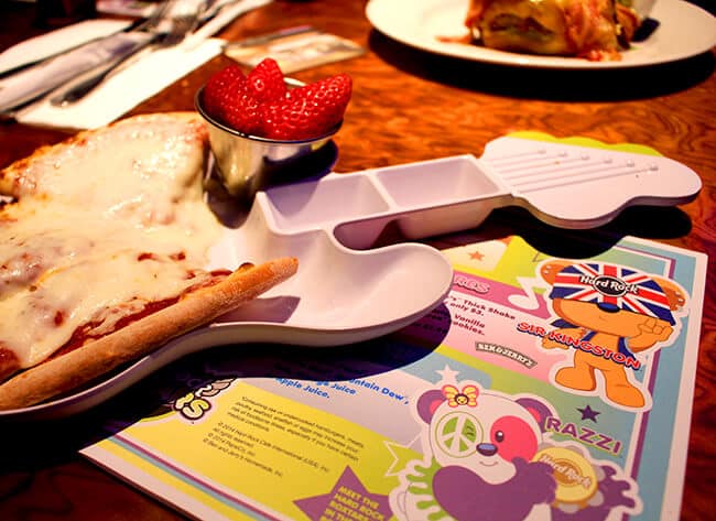 the kids food comes out on these adorable guitar plates the have compartments for dipping sauces. my boys were so excited and ate up their dinners with no complaints...just smiles.