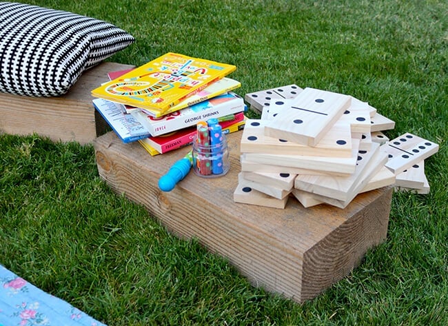 i brought out these giant dominos that are meant to be played outdoors and layed out a quilt with pillows on the lawn. this way the kids could lay out and read books under the stars.