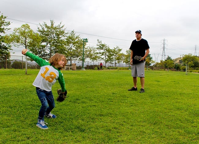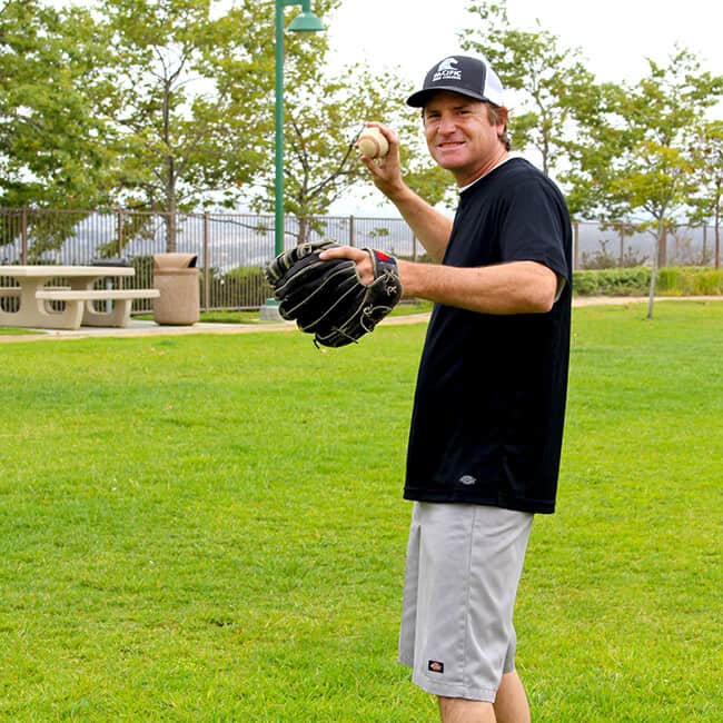 here dad is wearing an Advance Cooling Tee with UPF protection. it has moisture-wicking and mesh side insets which makes it perfect for playing a game of catch with our boys.